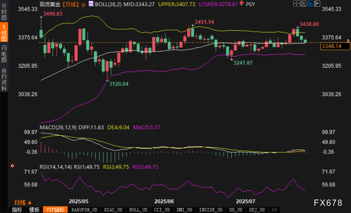周四公布的美国初请失业金数据和7月S&P全球综合PMI双双超预期,印证美国经济基本面韧性犹存。初请失业金人数降至217000人,创4月中旬以来新低,而综合PMI跃升至54.6,服务业指标更是升至年内新高的55.2。这些数据进一步稳固了市场对美联储7月维持利率不变的预期,推动美元指数温和走强,削弱黄金多头的买入意愿。  与此同时,美国总统对美联储主席的公开施压,加剧了市场对美联储独立性的担忧。尽管多位官员暗示降息有其合理性,但市场主流观点仍倾向于政策按兵不动,等待更多通胀与就业数据确认通胀压力可控。此外,泰柬边境局势紧张虽为金价提供有限支撑,但整体避险升温幅度有限,尚未形成持续驱动。  技术面:  从日线图观察,黄金在上行至3438.80美元后回落,目前重新逼近布林带中轨3343.27美元,日K连续收阴,呈现小幅回撤格局。当前布林带整体收敛,反映行情进入整理状态。分析认为上方布林带上轨3400.73美元构成关键阻力,若不能有效突破,短线或维持横盘震荡。布林带下轨支撑位于3278.81美元附近,若有效跌破则有可能打开下行空间。