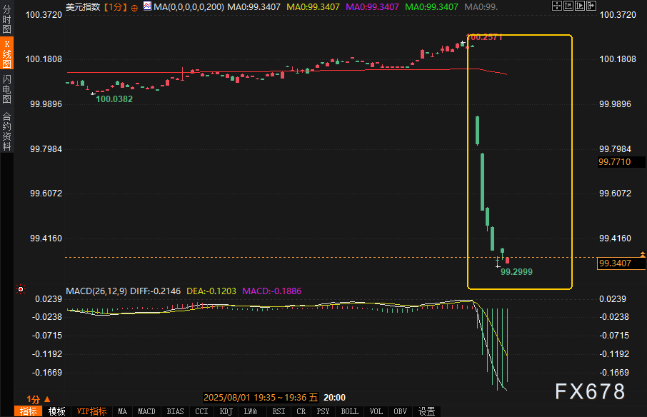 数据公布后,美元指数短线跳水105点,最低触及99.1899,现货黄金暴涨约34美元,最高触及3335.17美元/盎司,欧元兑美元等主要货币对也出现显著波动。以下从市场即时反应、降息预期变化及未来趋势展望三个方面展开分析。 市场即时反应:美元跳水,黄金暴涨,债市趋于宽松 非农数据公布后,金融市场迅速做出反应,呈现出典型的“避险”与“宽松预期”主导的行情。美元指数在数据公布后迅速下挫,跌幅一度达到0.42%,最低触及99.1899,刷新日内低点。相比之下,欧元兑美元快速拉升,日内涨幅扩大至1.01%,报1.1527,突破1.1500关键关口,创两个交易日新高。美元兑日元同样承压,日内跌幅达到1.00%,报149.22,显示市场对美元的看空情绪迅速升温。散户交易者普遍认为美元短期内可能进一步测试99.25的支撑位,若跌破或将进一步下探98.50区域。