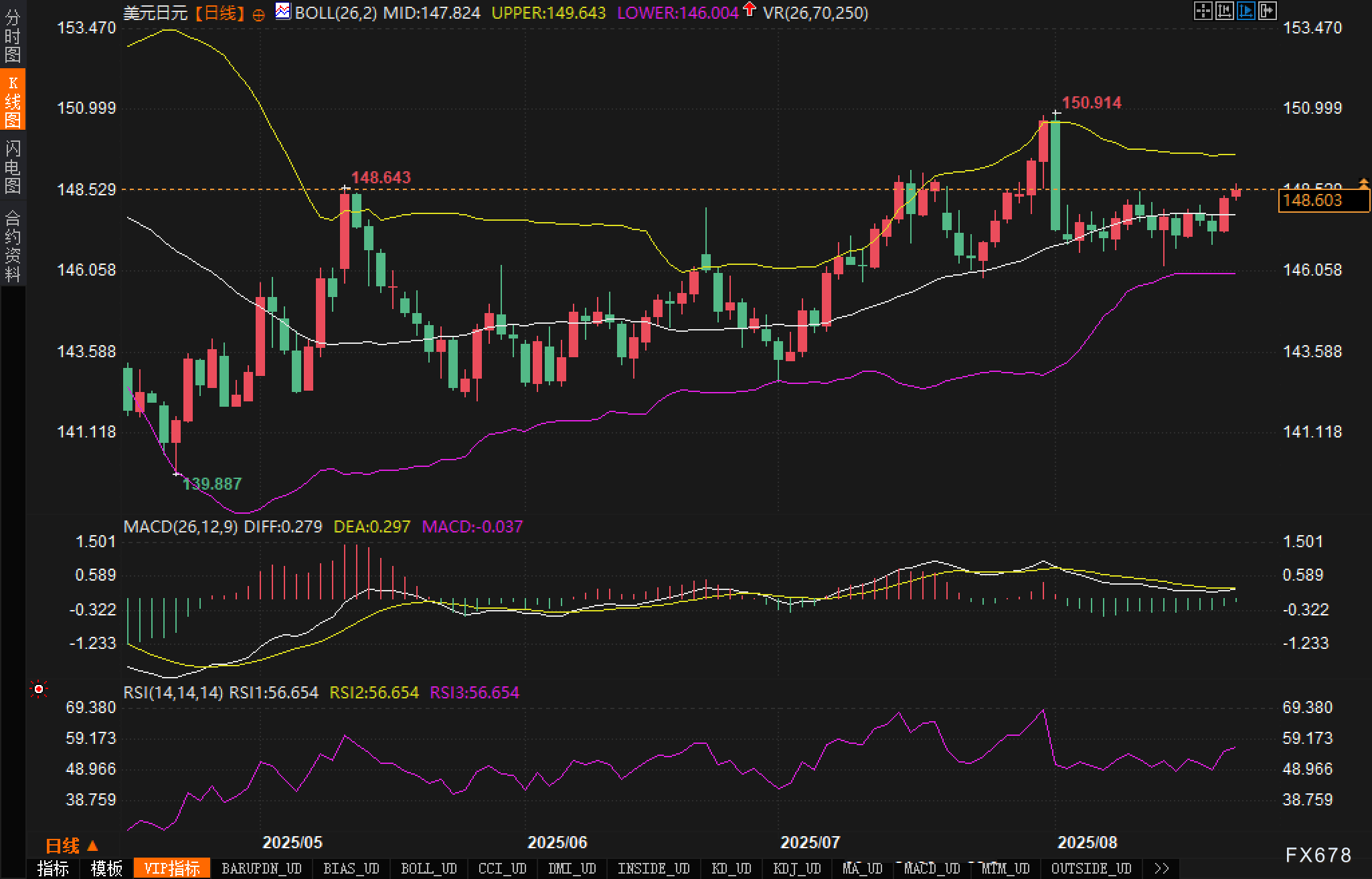 美元/日元汇价在近期内呈现加速上涨的趋势。当前汇价已接近148.80,并靠近布林带上轨(149.64),显示出市场的突破行为。布林带的收窄暗示价格波动的收窄,可能预示着未来的一波突破。