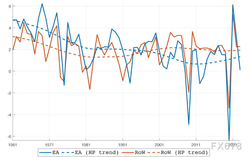 尽管存在这种增长分化,欧元区贸易差额却始终保持顺差状态(上图中左起第一张小图),且同期欧元区与其他地区的实际汇率也未呈现明显趋势(左起第三张小图)。在此期间,欧元区的贸易开放度(以欧元区对外出口与进口之和占GDP的比重衡量)自1999年以来已从15%翻倍至30%(第二张小图),而其他地区的相对贸易开放度则保持稳定。 这些现象引发两个关键问题,一是欧元区贸易顺差在多大程度上由生产率增长疲软所致,二是为何在生产率差异持续存在的情况下,实际汇率仍能保持稳定。 为解答这些问题,整个研究利用1999年至2023年欧元区与其他地区的数据,该分析框架的核心创新点在于对趋势性冲击的明确建模。 此研究利用经估算的模型,对关键宏观经济变量进行历史冲击分解。在估算的模型中,欧元区实际GDP的持续疲软,主要由一系列欧元区生产率增长的负面冲击导致,而其他地区的强劲增长则进一步加剧了这一态势。趋势增长路径的分化,是两个地区之间持续存在产出与收入差距的重要原因。 新分析框架揭示了欧元区长期顺差的秘密 我们的历史分解结果显示,周围国家相对欧元区生产力的提升对欧元区贸易顺差的贡献占比介于1/4至1/2之间。 欧元区以外其他地区出现生产力提升,会推升其企业与人民未来收入与财富水平,进而促使家庭与企业增加在欧洲以及其他地区国家的消费和投资。 这会暂时拉动其他地区对欧元区出口的需求,同时降低其他地区的储蓄水平。欧元区增长冲击的负面影响对贸易差额产生的效应,即欧元区生产率疲软会压低预期收益与投资规模,引发资本外流,并抑制进口。 因此,欧元区长期保持贸易顺差的秘密在于,国外生产力提升增加了国外兑欧元区商品的购买,而欧元区经济增长缓慢,人们收入增长缓慢则抑制了居民与企业的对外的消费意愿因为消费是收入的函数C=F(Y),最终欧元区对外长期处于贸易顺差。 长期顺差促进欧元升值,但为何实际汇率却变化不大? 货币升值会影响贸易条件,让进口产品相对更便宜,但出口产品变贵。所以实际汇率变动对一国外贸有重大的影响。 标准理论预测,其他地区趋势性生产率增长加快,应会导致欧元区实际汇率(实际汇率(ε)=名义汇率(E)×(外国价格水平/本国价格水平)出现趋势性升值。 但数据显示,实际汇率(在中期维度上)相当“平稳”。这一看似矛盾的现象可通过贸易结构性变动来解释:欧元区进口价格(尤其是非大宗商品进口价格)的趋势性下行,反映出其他地区可贸易部门(尤其是中国及其他新兴市场国家)的生产率增长加快。 这一变化降低了欧洲家庭与企业面临的外国商品相对价格,提升了欧元区的进口份额,并缓解了实际汇率面临的升值压力。 与此同时,欧元区的本土偏好出现长期下降,消费者对外国商品的偏好增强,欧元区生产商在其国内市场的份额亦有所流失。这些发展趋势之间可能存在关联:其他地区可贸易部门生产率提升的同时,其产品质量与种类也得到改善,进一步加剧了进口渗透态势。 最后,该模型还揭示了欧元区投资不足的外部决定因素。其他地区的正向生产率冲击不仅会推动外国吸收增加(Y=A(吸收)+(X-M)即外国经济体在其本国的消费增加),还会推高全球利率与外国相对收益率。 在金融开放的背景下,这些变化会削弱欧元区内部的投资动机,并挤出其国内吸收。因此,欧元区投资的持续疲软,不仅反映其国内需求不足,还受到通过全球资本市场发挥作用的外部结构性因素的影响即外国的生产力提高。 政策启示 欧元区经济增速长期跑输,但产品的品质和制造能力确实稳定且成熟,于是长期顺差的秘密在于其长期低于周边国家的GDP增速导致其本国收入增长不明显,投资和消费没有活力减少了进口,而经济相对活跃的其他国家的收入增长促进了他们对欧盟的进口。 这不是长久之计,因为产品品质和竞争力不会一成不变,欧元区与其他地区之间确实持续存在的生产率增长的差距,解决这一生产率短板,需要通过提振欧元区需求与吸引资本流入,同时还有望帮助缩小贸易顺差带来的结汇升值问题。 改善初创企业融资环境、减轻监管负担以及加大技能投资,应成为实现这一目标的首要任务。 其次,尽管短期财政与货币政策仍是应对周期性波动的重要工具,但配套改革应致力于提升潜在产出。分析表明,外部失衡既反映周期性因素的影响,也体现结构性因素的作用。单纯以需求为核心的解读逻辑,可能会忽视这一关键事实。 第三,考虑到当前围绕竞争力展开的政策讨论,投资水平偏低与生产率疲软是阻碍增长的主要因素,并呼吁制定新战略以增强经济的供给侧能力。 外部因素——如外国生产率增长加快与全球贸易结构变革——对欧洲经济结果具有显著影响。这凸显出欧洲需制定一套连贯的战略,既要应对内部结构性挑战,也要适应外部发展变化。