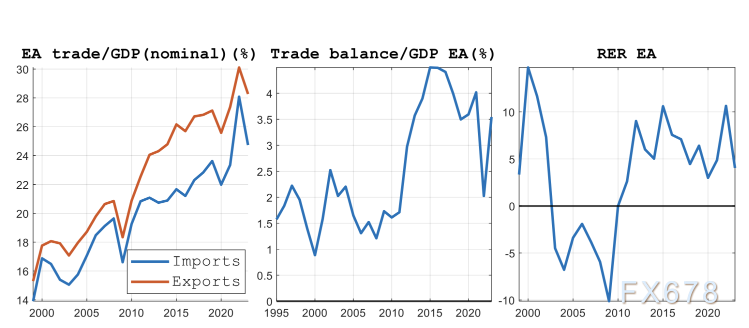 (欧元区GDP自1999年开始长期跑其他地区) 在此期间,该地区贸易开放度不断提升,但实际汇率(RER)亦无明显趋势。部分观点认为,欧元区贸易顺差为正,反而反映出了其国内需求不足,尤其是投资疲软。 所以不能通过长期的贸易顺差证明欧洲经济的实力,德拉吉(2024年)提出,单一市场一体化程度不足与资本市场深度欠缺抑制了投资活动,导致增长向外部需求倾斜,并维系了贸易顺差格局。 关于欧元区失衡的现有长期文献,大多聚焦于欧元区内部的调整问题,多项研究指出,在解释欧元区需求疲软(尤其是金融危机与主权债务危机之后)的成因时,资源错配与金融市场缺陷起到了关键作用。 出现了新的对于贸易顺差现象研究的框架 在一项最新研究中通过摒弃“经济的外部冲击具有暂时性”这一普遍假设,该分析框架对外部调整的长期驱动力进行了量化测算。 其核心结论是:欧元区生产效率增速持续低于其他地区,是贸易顺差的核心驱动因素。而贸易结构冲击——尤其是欧元区本土偏好下降与进口价格走低——同样发挥关键作用,抵消了实际汇率面临的升值压力。 研究结果表明,欧洲持续贸易顺差与投资疲软,不仅源于其国内需求状况,还与长期存在的生产率差距及全球贸易的结构性变革密切相关。分析支持近期有关重启改革、以提升生产率并增强该地区应对全球冲击韧性的呼吁。 欧元区实际汇率下行意味着欧元升值。实际汇率以相对GDP平减指数为衡量基准,并以与2010年水平的百分比偏差形式呈现。