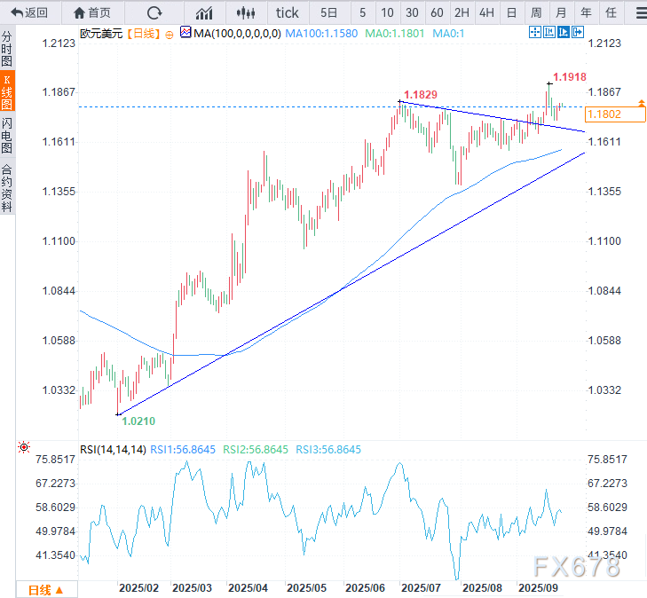美元受风险偏好压制 风险偏好使美元持续承压,美联储主席杰罗姆·鲍威尔消息传遍各大通讯社,几乎复述了他在联邦公开市场委员会(FOMC)新闻发布会上的讲话。 他表示政策路径艰难,因为美联储必须“同等重视”双重使命的两个目标。他重申劳动力市场的下行风险虽已增加,但通胀在趋于更好平衡之际仍“略有偏高”。他补充称当前货币政策立场仍“适度紧缩,让我们能够从容应对潜在的经济变化”。 数据显示,美国采购经理人指数(PMI)与欧元区的数据显示商业活动放缓,这可能影响经济增长数据的发布,特别是美国第二季度实际GDP年化季率终值将于本周公布。 美联储与欧洲央行货币政策的分化,将支撑欧元升值 尽管存在政策分歧,但根据Prime Market Terminal利率概率工具显示,市场预计美联储仍将在10月会议上降息。而欧洲央行在上次会议后,行长拉加德明确表示“通缩进程已结束”,暗示将维持利率不变。 周三市场将关注德国9月IFO商业景气指数、现况指数及预期指数。美国方面,市场正等待住房数据公布及其他美联储官员的讲话。 尽管美欧经济放缓,欧元仍维持盘整 早前美国9月标普全球制造业PMI从前值53.0降至52.0,服务业PMI自8月的54.5下滑至53.9。标普全球数据显示,由于企业提及“关税是成本进一步上升的主因”,9月支付价格指数从8月的60.8升至62.6。 美联储主席鲍威尔指出“就业下行风险改变了风险平衡,促使上周实施降息”,并表示降息使政策转向更中性立场。尽管承认就业风险,他强调“双向风险意味着不存在无风险的政策路径”。 亚特兰大联储主席博斯蒂克对采用通胀目标区间持开放态度,并预警未来通胀压力可能加剧。 美联储理事鲍曼暗示预计2025年将进行三次降息以支撑劳动力市场。而芝加哥联储主席古尔斯比则强调美联储必须使通胀回归2%的目标。 欧元区9月HCOB制造业PMI从50.7降至49.5,低于50.9的扩张预期;同期服务业PMI升至51.4,优于8月及50.5的预期值。 根据Prime Market Terminal数据显示,市场预计美联储在10月19日会议降息25个基点的概率达90%以上。 技术展望 欧元/美元升势保持完整,随着“看涨吞没”K线形态的出现,汇价重新靠近1.1800关口。尽管该货币对曾触及本周高点1.1820,但动能平淡,多头未能推动汇价测试1.1850水平,后续更关键的年内高点阻力位于1.1918。 相对强弱指数(RSI)于中线上方走低。虽然当前指标呈积极态势,但动能不足可能令欧元/美元维持横盘整理。 下行方面,若汇价跌破1.1800支撑,下一关键支撑位将看向1.1750,随后是1.1700关口。重要支撑区间位于100日移动均线(1.1580)与8月27日摆动低点1.1574-1.1560形成的共振带。