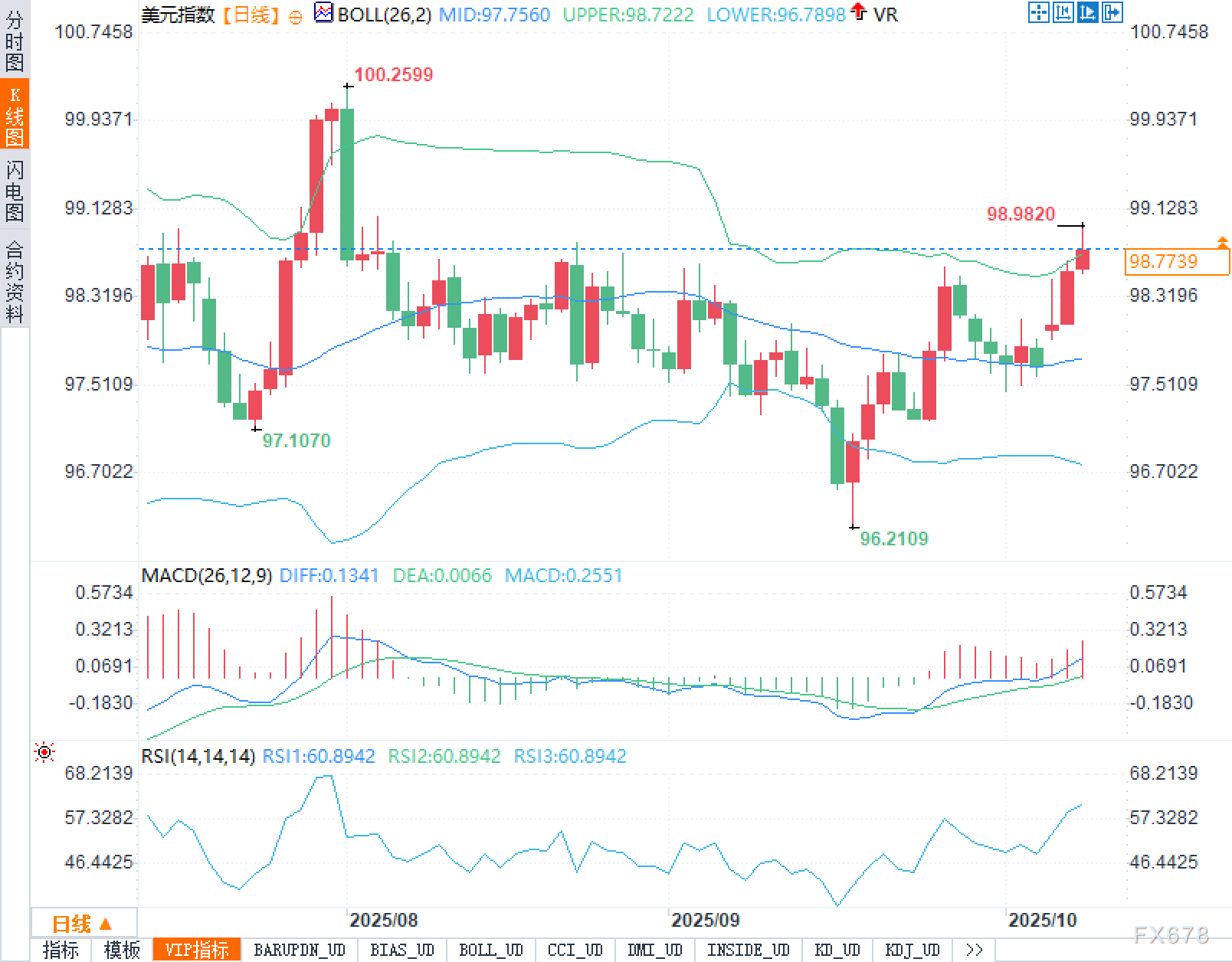 基本面 近期美元对政府停摆相关风险表现出显著韧性,原因在于:其一,市场普遍认为美政府停摆对经济冲击有限;其二,海外政治进展分散了对国会争执的注意力;其三,“没有坏消息就是好消息”——停摆导致的数据缺位,尤其是就业领域的数据推迟,短线反而减轻了对美元的不利扰动。真正的考验在下周,若原定于10月15日公布的9月CPI被推迟,美元可能面临一轮“事件前撤退”。预测市场Polymarket当前给予停摆至少延续到下周三的概率约为三分之二,这为“数据真空期”再续一周提供了定价基础。 在数据缺席的窗口期,联储官员密集讲话与FOMC会议纪要成为主角:周内将听到多位官员发声,主席鲍威尔周四发言为预录,无问答。更受关注的是本次纪要:一方面,停摆令“官方数据噪音”减少;另一方面,关于Miran加入理事会的背景色彩,以及他大概率在本月再次以“支持降息50bp”的立场提出异议,均可能在纪要或舆论场获得放大。Bowman近期言论显示,或在本月会议上与Miran形成共鸣。此外,明尼阿波利斯联储主席卡什卡利已明确年内仍看“两次降息”,与“年内再降两次”的前瞻指引一致。 技术面: 从日线图看,布林中轨97.7560、上轨98.7222、下轨96.7898。当前价已有效站上上轨,显示布林带口开始向上张开,价格脱离前期横盘,进入“带外趋势段”。近端阻力位在98.9820,上方关键高点在100.2599;近端低点97.1070与关键低点96.2109构成台阶式底部。