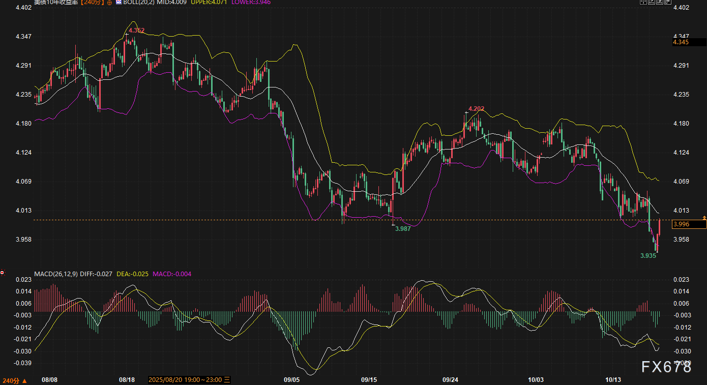 在政府关门之前,市场对经济放缓的预期已相当充分。此前的宏观数据脉络,如部分制造业采购经理人指数(PMI)的持续收缩迹象,以及其他先行指标的疲软表现,已为美联储(Fed)的紧缩路径带来压力。然而,随着政府停摆造成重要经济数据(如进出口价格和住宅建设报告)被推迟发布,市场被迫进入“数据真空”期。新的变数很快取代了传统的基本面担忧。 核心基本面分析:流动性冲击与政策前景 当前市场焦点的核心在于两个关键事件:区域银行的信用风险爆发,以及美联储常设回购便利(SRF)的使用情况。 区域银行的孤立危机与避险反弹 近期,知名机构披露了西方联盟银行(Western Alliance Bank)和锡安银行(Zions Bank)因借款人欺诈指控和贷款减记而面临的风险。锡安银行股价暴跌13%,西方联盟银行股价也收低11%,引发了区域银行板块的集体恐慌。 市场对此的初步反应是传统的“避险买盘”(Flight to Quality),导致国债收益率短期内急剧下挫:两年期国债收益率一度触及3.376%的年内新低,而10年期国债收益率也迅速从高位(4.3936%)回落。 然而,我们倾向于将此次事件定性为孤立的(isolated)而非系统性的(systemic)。此前的硅谷银行(SVB)事件已经证明,市场情绪极易被放大。资深交易员认为,任何基于此次事件产生的国债避险买盘都应被视为战术性套利机会,即倾向于抛售因避险情绪催生的收益率下行。 流动性压力与QT的终结预期 更值得关注的信号来自美联储的流动性工具。在过去几天内,有银行两次动用了美联储的常设回购便利(SRF),在两天内借入总计150亿美元资金。 知名机构经济学家对此点评指出,回购利率的飙升表明美联储通过缩减资产负债表(即量化紧缩,QT)来减少银行体系超额准备金的努力可能已接近尾声。如果SRF的使用与上述面临欺诈指控的银行无关,这将是更广泛流动性压力的信号。这一事件为市场提供了一个中期的鸽派信号:美联储可能最早在今年12月宣布结束QT。这一预期将对未来数月的国债收益率构成结构性支撑(价格上涨,收益率下行)。 政策真空与地缘贸易风险 政府停摆导致了周五关键的进出口价格和住宅建设数据无法公布。市场失去数据指导,只能依赖于市场条件和官员表态。周五,圣路易斯联储主席穆萨勒姆(鹰派,具有投票权)将就经济和货币政策发表讲话。在缺乏关键数据佐证的情况下,其讲话的市场影响力存在不确定性。 在更广阔的宏观背景下,市场的高波动率轮廓预计将持续到11月,届时将面临有关贸易关税言论(如美国最高法院对关税裁决的临近)和地缘局势的不确定性。关税言论引发了市场对全球经济和供应链的担忧,加剧了避险情绪的短期波动。现货黄金(4312.87美元)逼近历史高点,以及美元指数(DXY)持续运行在99关口下方,都印证了当前市场对避险资产的强烈需求。 深度技术解析:收益率走势与曲线陡峭化 10年期美债技术分析 当前10年期美债收益率期货(240分钟图)报价3.996%。从技术指标来看,布林带中轨位于4.009%,是决定短期趋势的关键阻力,若收益率突破并站稳此位,走势将偏向看空(即收益率上升);而布林带下轨3.946%则构成近期强劲支撑。MACD指标的读数显示(DIFF -0.027,DEA -0.025,柱状线 -0.004),DIFF线虽低于DEA且柱状线为负,但数值均极小。这技术上支持收益率的下行趋势,但同时也强烈暗示此轮动能已近乎衰竭,短期内存在反弹或盘整的需求。交易员设定的核心战术观察区间是3.93%至3.99%,任何对该区间的突破都将确立短期方向。 战术焦点:当前的报价位于布林带中轨之下,但MACD显示多空力量均衡,战术偏向应是平仓观望(Flat),重点观察周末收盘能否守住4.00%心理关口之下,以维持短期看多(收益率下行)的希望。