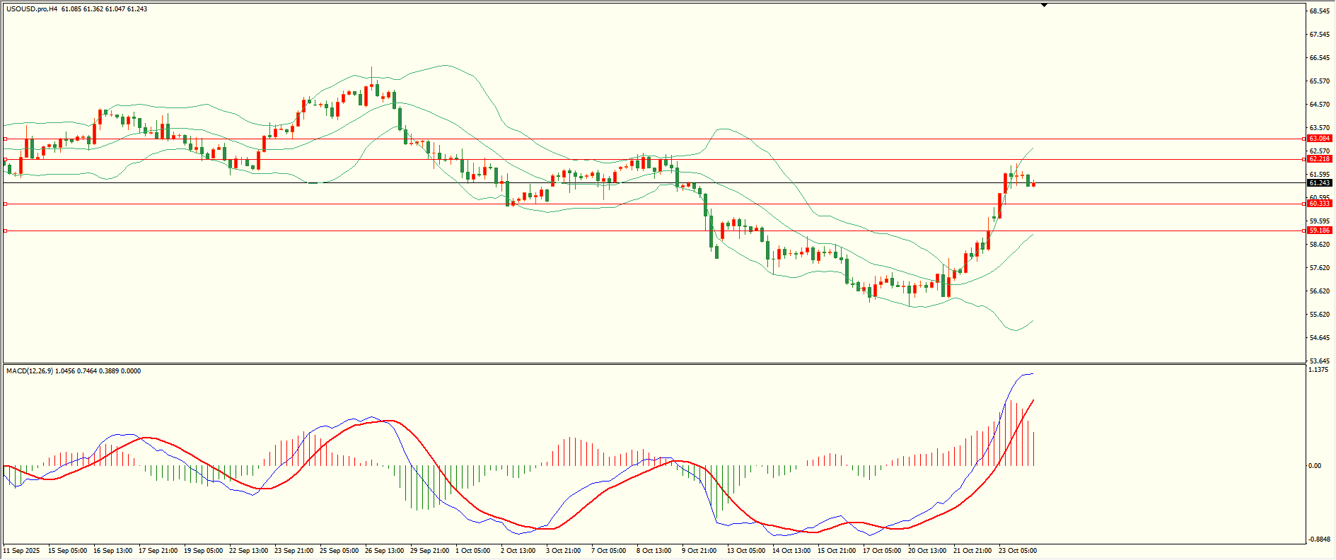 原油昨日亚市开盘后延续走高,至收盘触及第二阻力承压下行,日线报收大阳线,目前上方面临前高阻力,谨防冲高回落,从4H来看,布林中轨偏上,MACD零轴上方运行,日内下方首要支撑60.35,第二支撑59.15,上方阻力62.20,63.05,保持在第一支撑上方短线有望测试第一阻力。