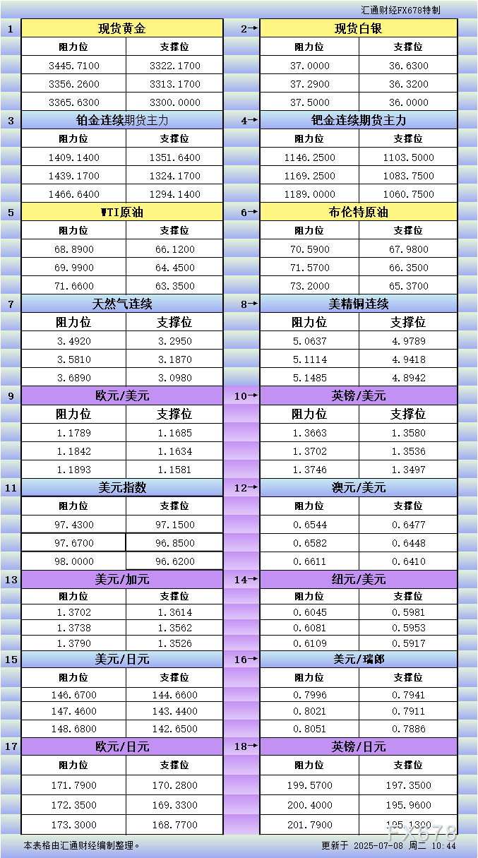 XM外汇官网7月8日亚市更新支撑阻力:18品种支撑阻力(金银铂钯原油天然气铜及十