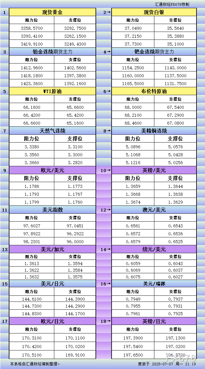 XM外汇官网7月7日美市更新支撑阻力:18品种支撑阻力(金银铂钯原油天然气铜及十