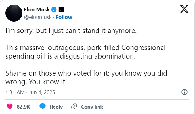 XM外汇官网登陆入口马斯克怒喷特朗普“大而美”法案:忍不了了 令人厌恶至极
