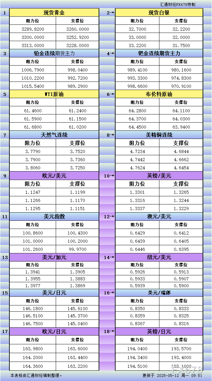 XM平台官网:5月12日亚市更新支撑阻力:18品种支撑阻力(金银铂钯原油天然气铜